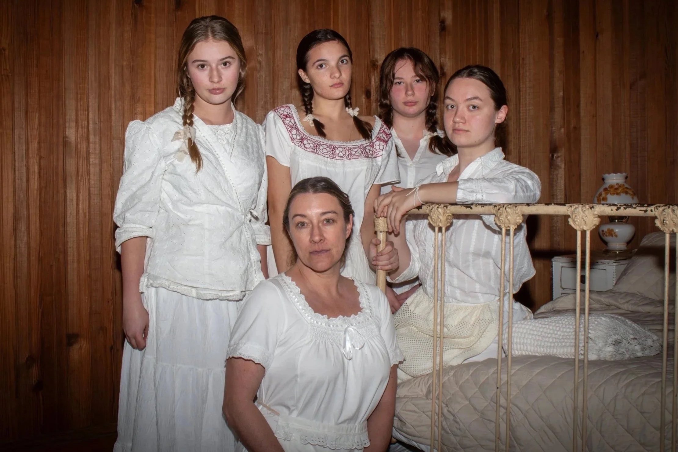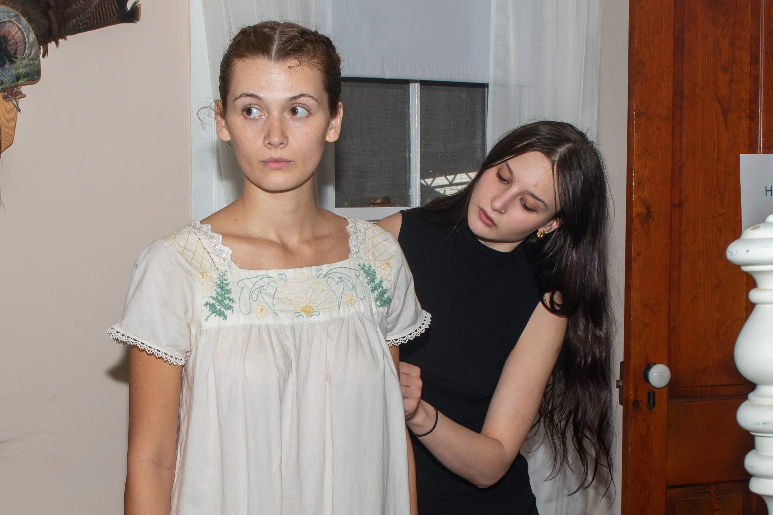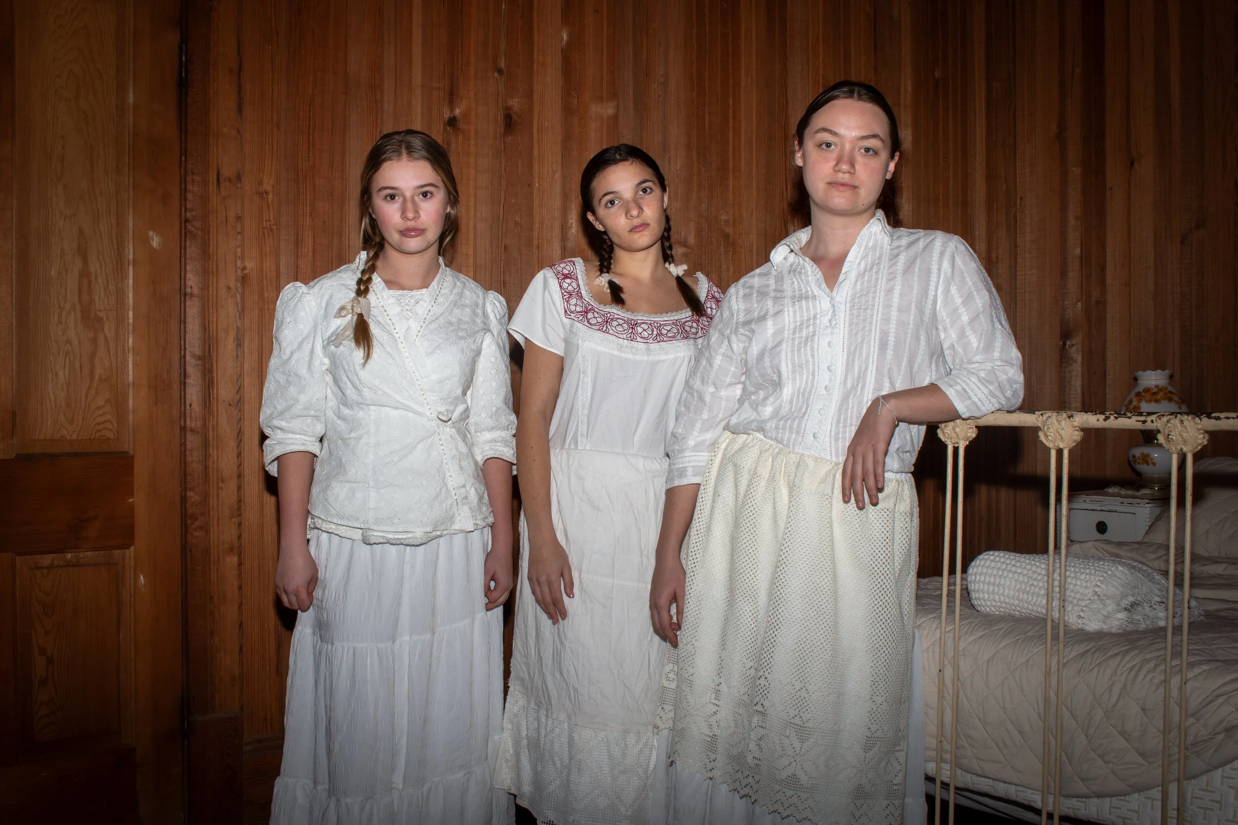 Bethany’s “family” presented a unique design challenge, encompassing not only central characters, her mother Mary, younger sister Clarissa, and fellow member Marta, but also up to fifteen background performers at a time. To create a cohesive visual world for the extras, I relied heavily on thrifted white garments, sourcing and up cycling vintage textiles and lace panels into modified aprons, hair kerchiefs, and layered garments. Even background figures were treated with careful consideration; continuity and believability were essential in this secular world. Layering became a key tool, allowing silhouettes and textures to read clearly from a distance while reinforcing a shared cultural identity.