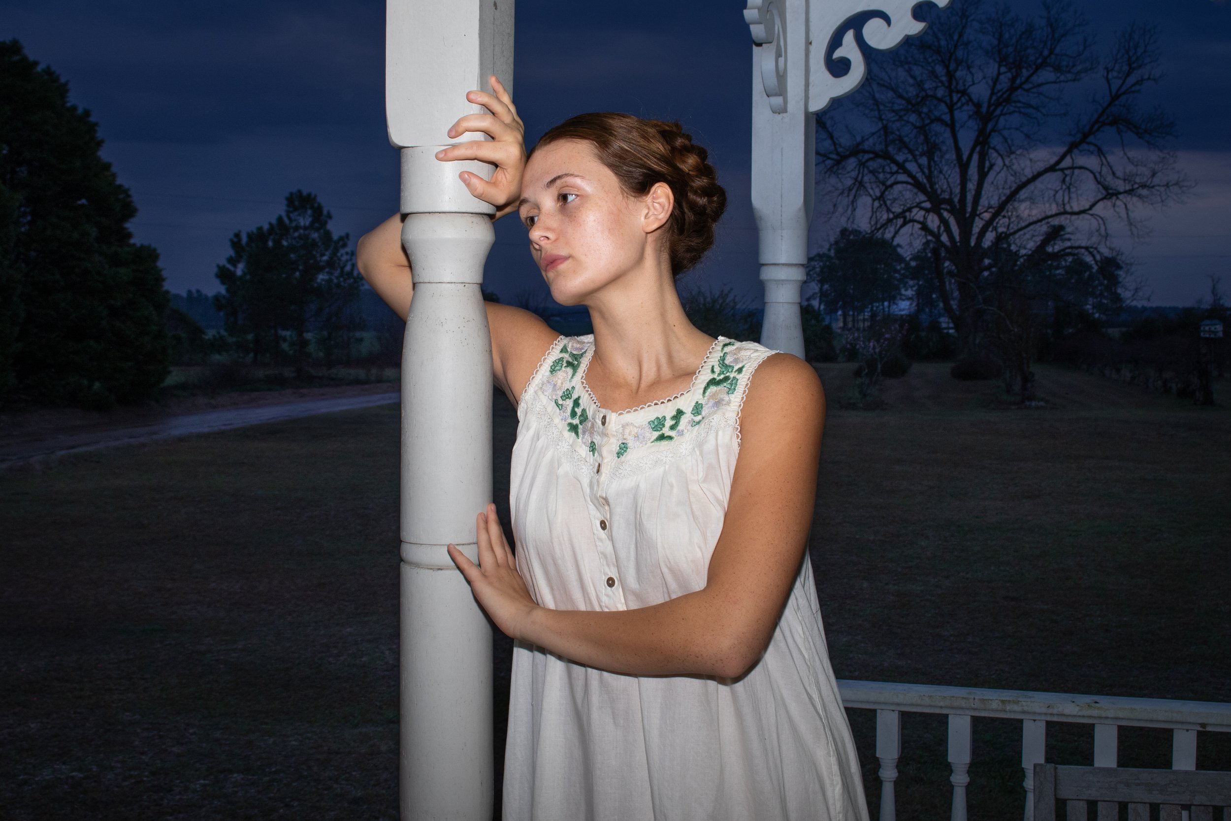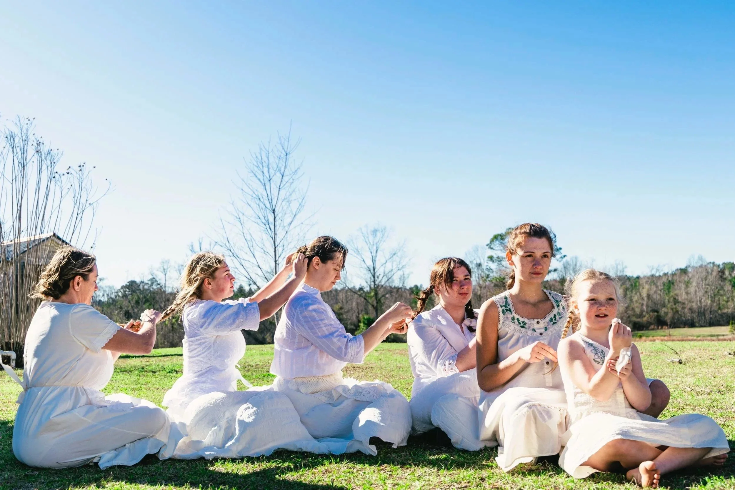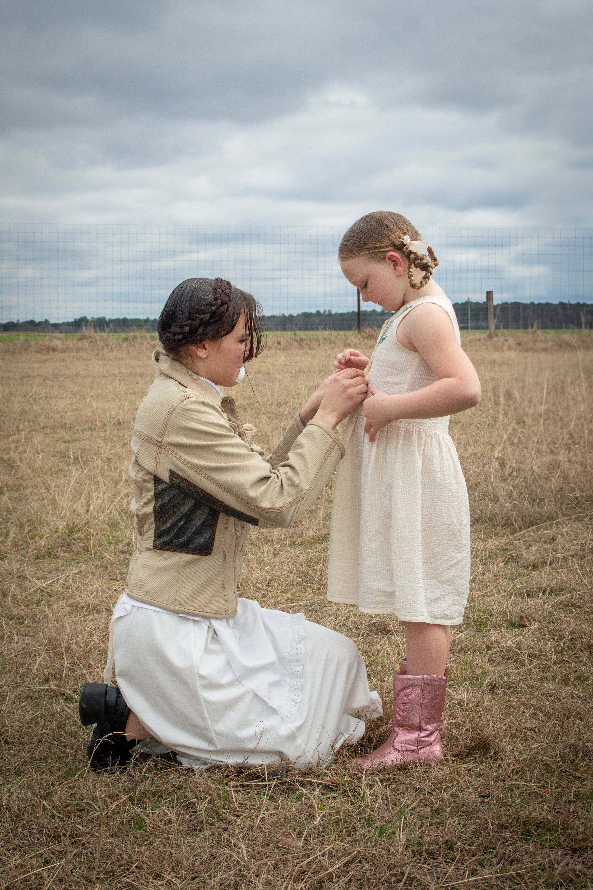 Bethany’s “family” presented a unique design challenge, encompassing not only central characters, her mother Mary, younger sister Clarissa, and fellow member Marta, but also up to fifteen background performers at a time. To create a cohesive visual world for the extras, I relied heavily on thrifted white garments, sourcing and up cycling vintage textiles and lace panels into modified aprons, hair kerchiefs, and layered garments. Even background figures were treated with careful consideration; continuity and believability were essential in this secular world. Layering became a key tool, allowing silhouettes and textures to read clearly from a distance while reinforcing a shared cultural identity.
