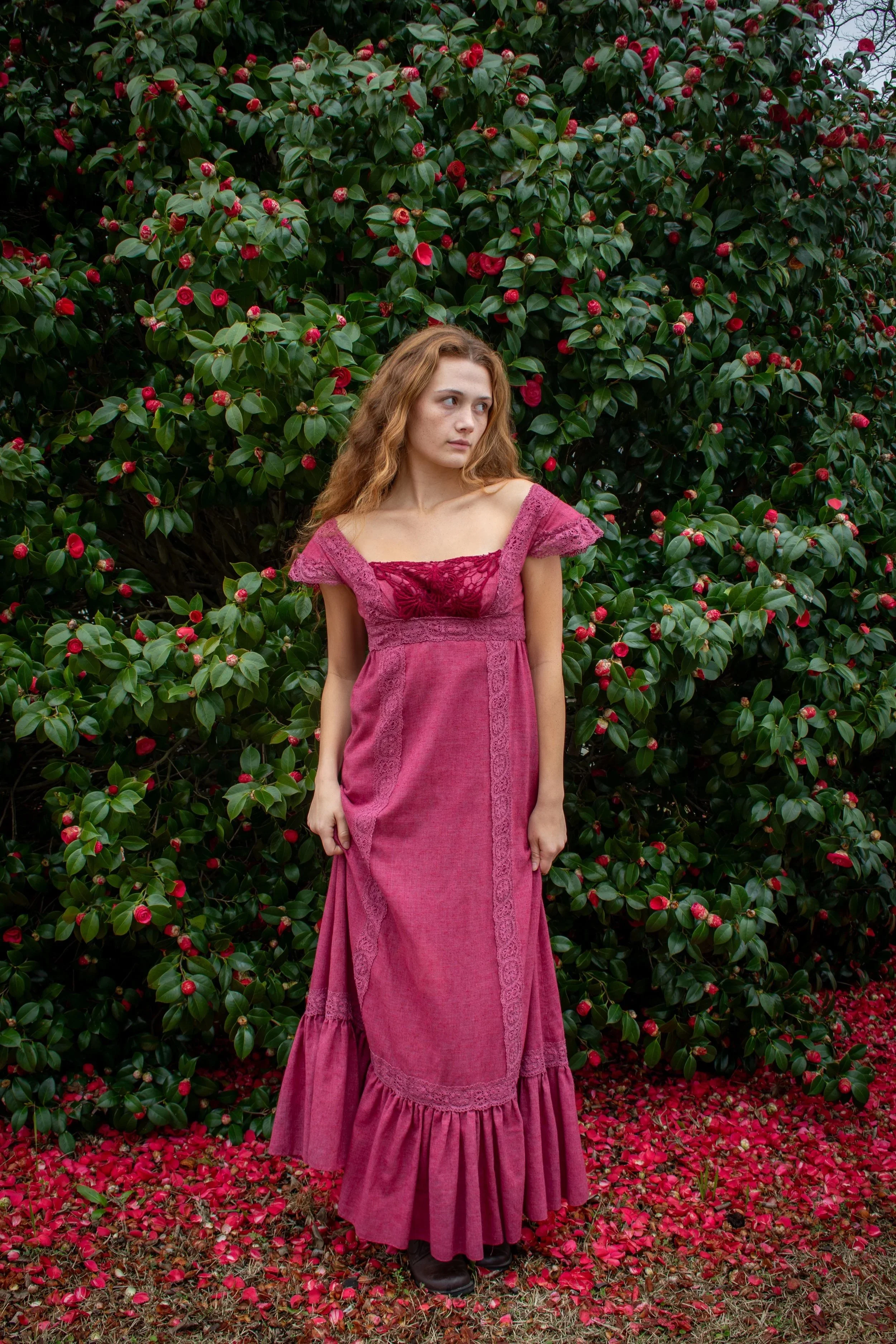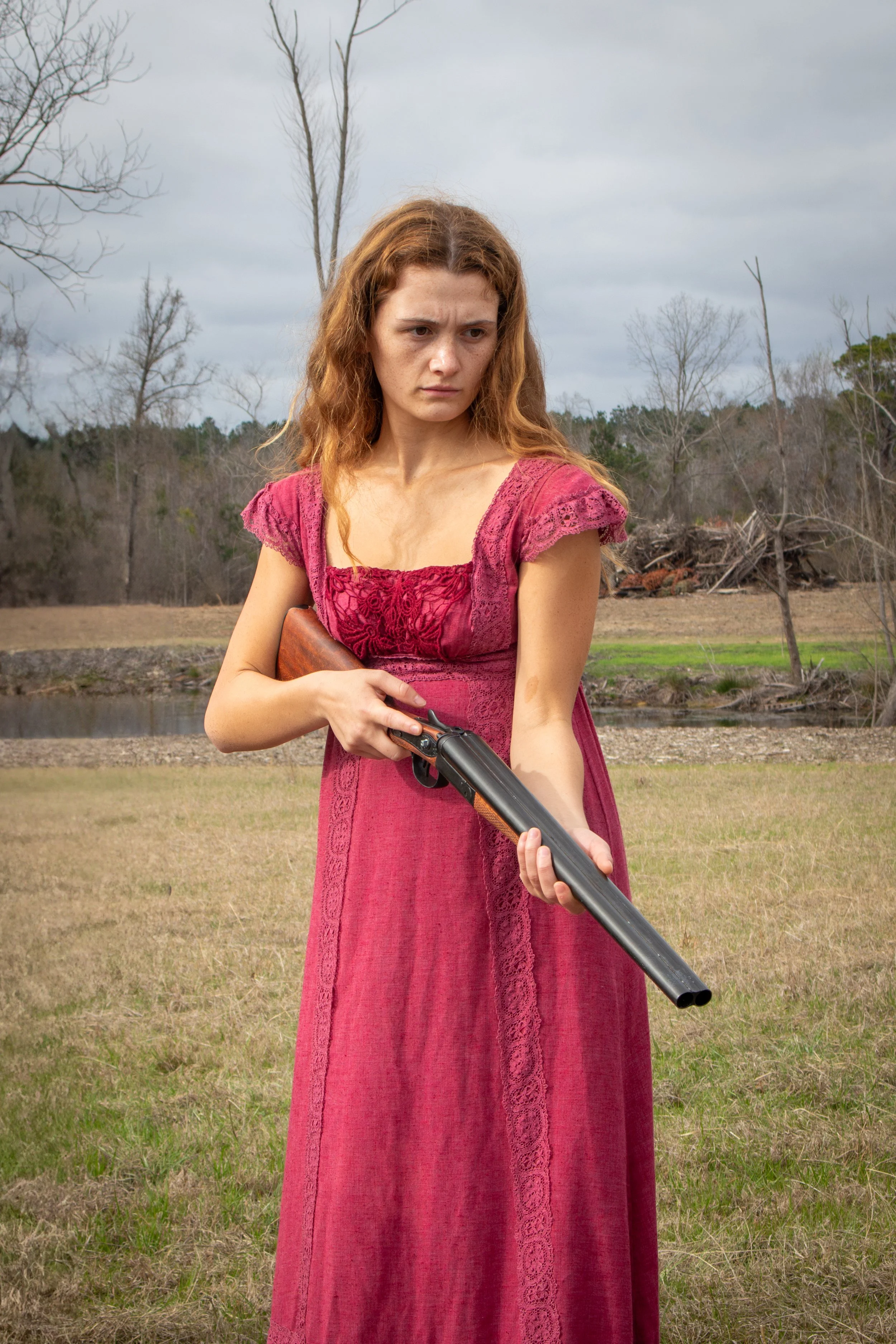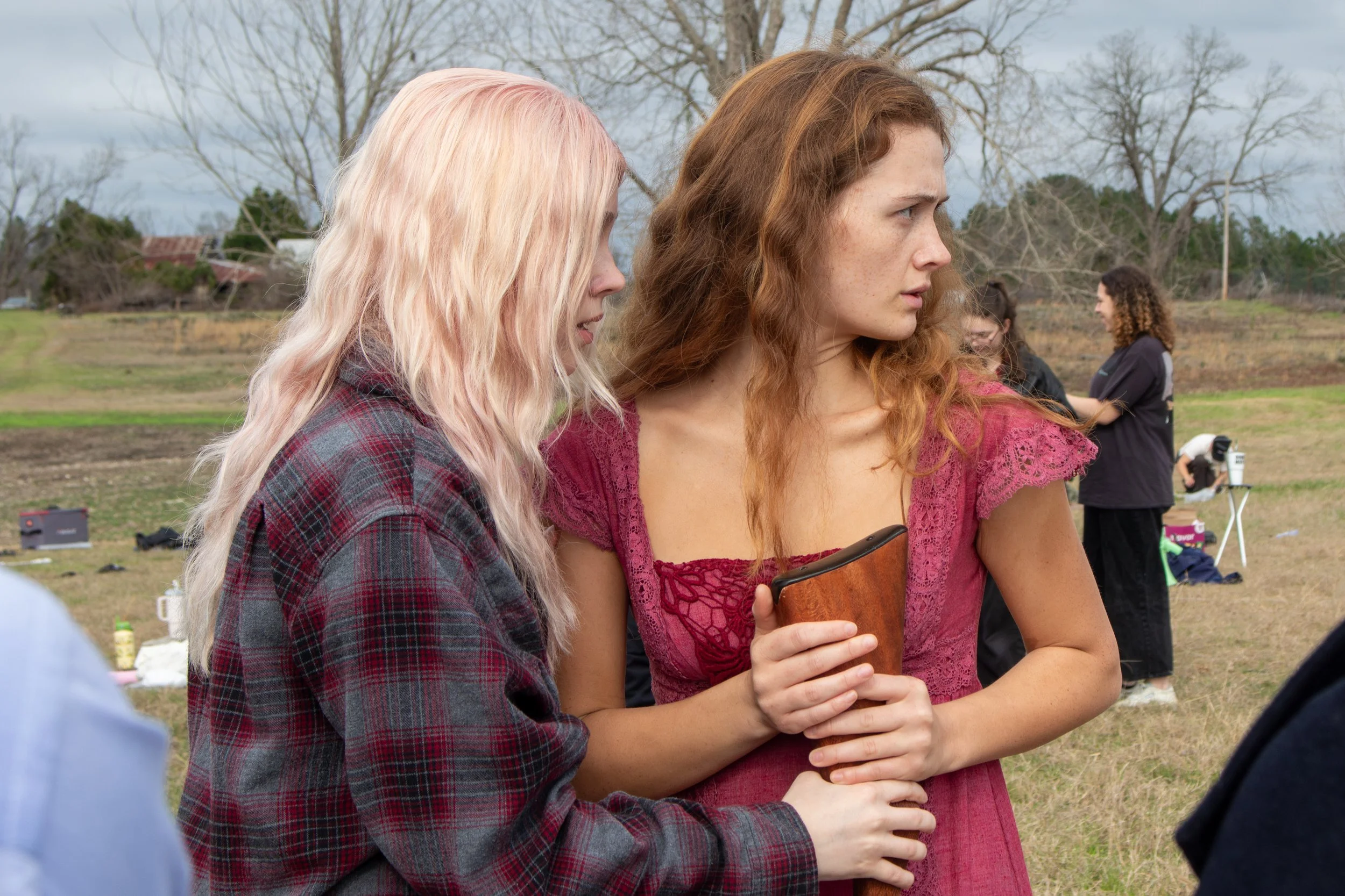 The “Awakening Dress” is a central piece within the narrative, designed to stand apart visually both on camera and within the cult’s community. I sourced a 1970s prairie wedding dress from eBay to suggest, believably, that generations of women have worn it before Bethany. I distinguished it beyond color alone, through added lace trims and paneling, creating texture in contrast to the embroidered motifs seen in other white garments. I conducted multiple dye tests before committing to the final treatment, a calculated risk that ultimately enhanced the dress’s depth on screen. The garment was designed to fit multiple women, such as Bethany’s mother in a flashback, leading me to install an adjustable lace-up corset back. This not only supports narrative continuity but also allows for shots requiring the dress to be unlaced on camera and quick changes on set.