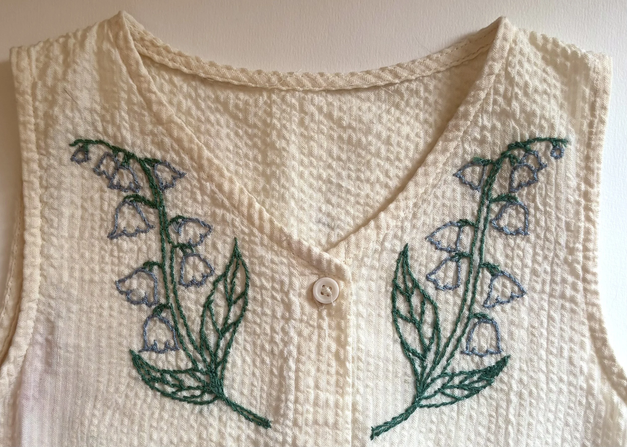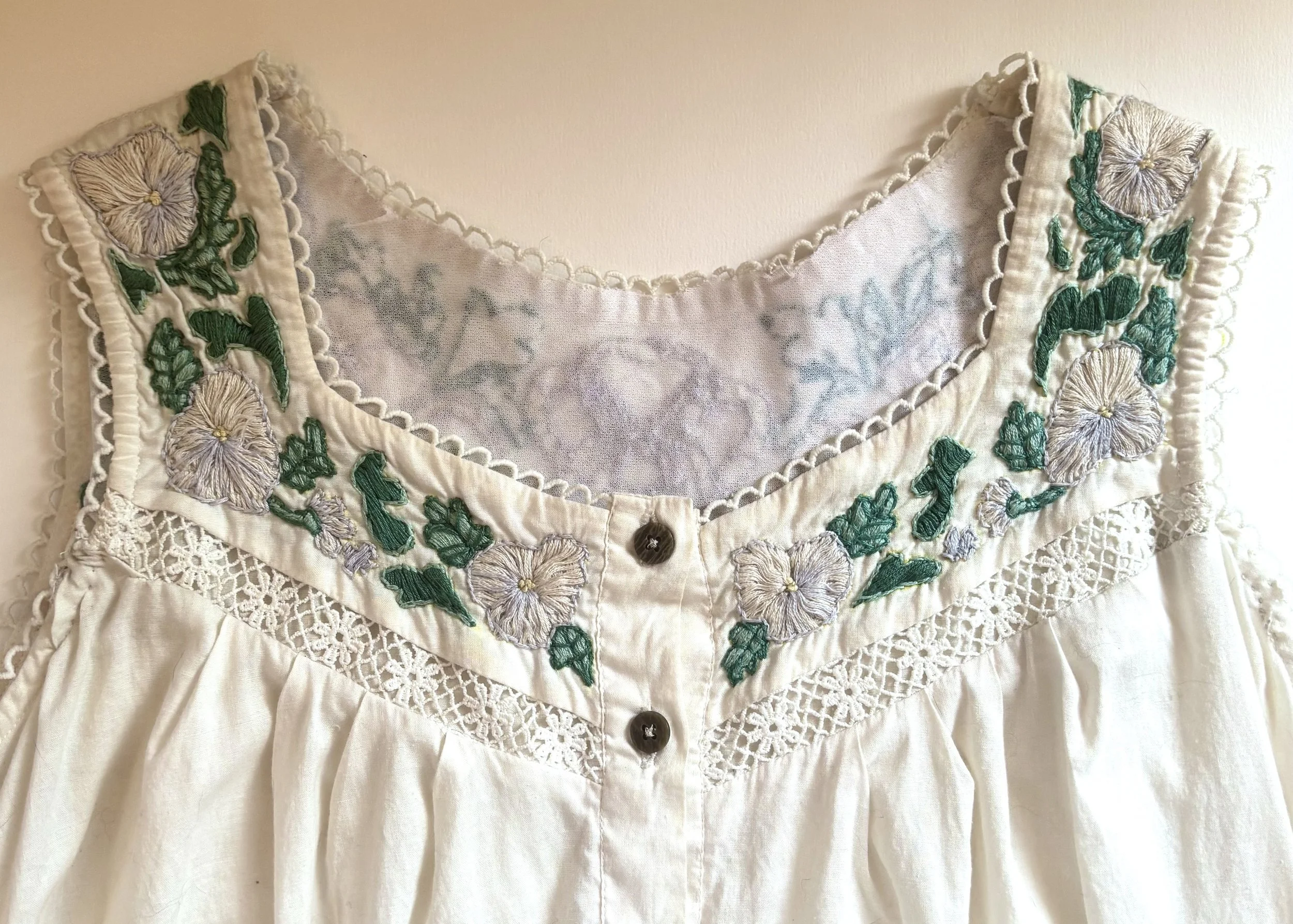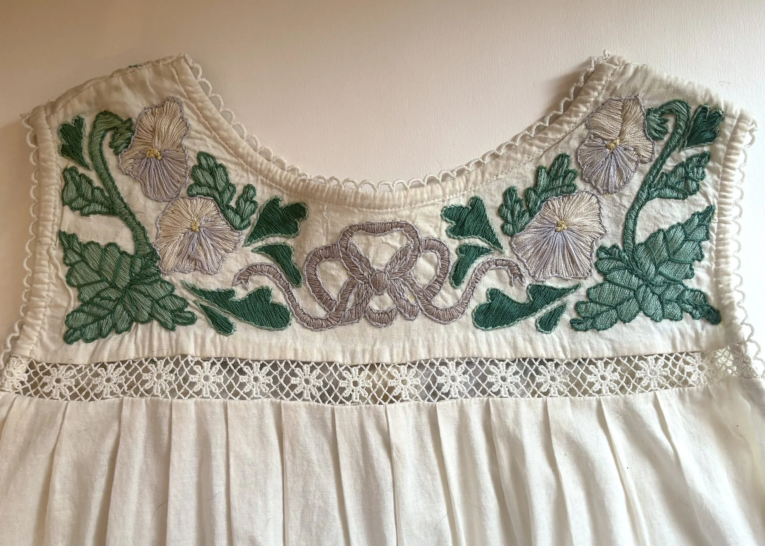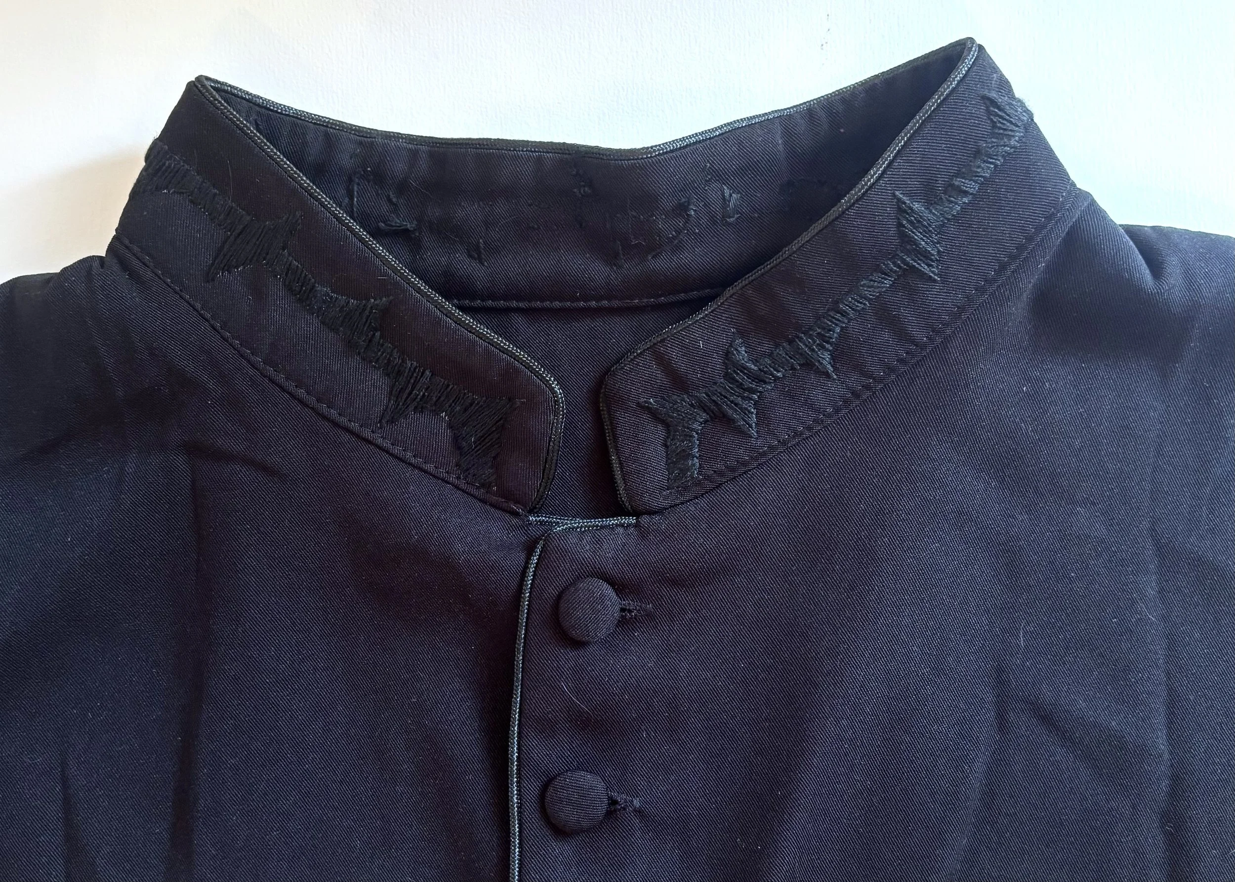 As seen in the images below, my embroidery work was rooted in Victorian floriography, with each motif chosen to subtly communicate emotional and narrative subtext for each character. Bethany’s dresses feature violets to symbolize sapphic love, paired with bow motifs representing the ties that bind. While another has daisies convey loyal love and the sentiment “I’ll never tell,” with ferns to suggest secret admiration and sincerity. In contrast, Clarisse’s dress incorporates lily of the valley to reflect innocence and purity, reinforcing her place within both the family and its moral framework. The Prophet’s clerical collar is wrapped in thorn motifs that shift subtly in the light, symbolizing sin, concealment, and control.