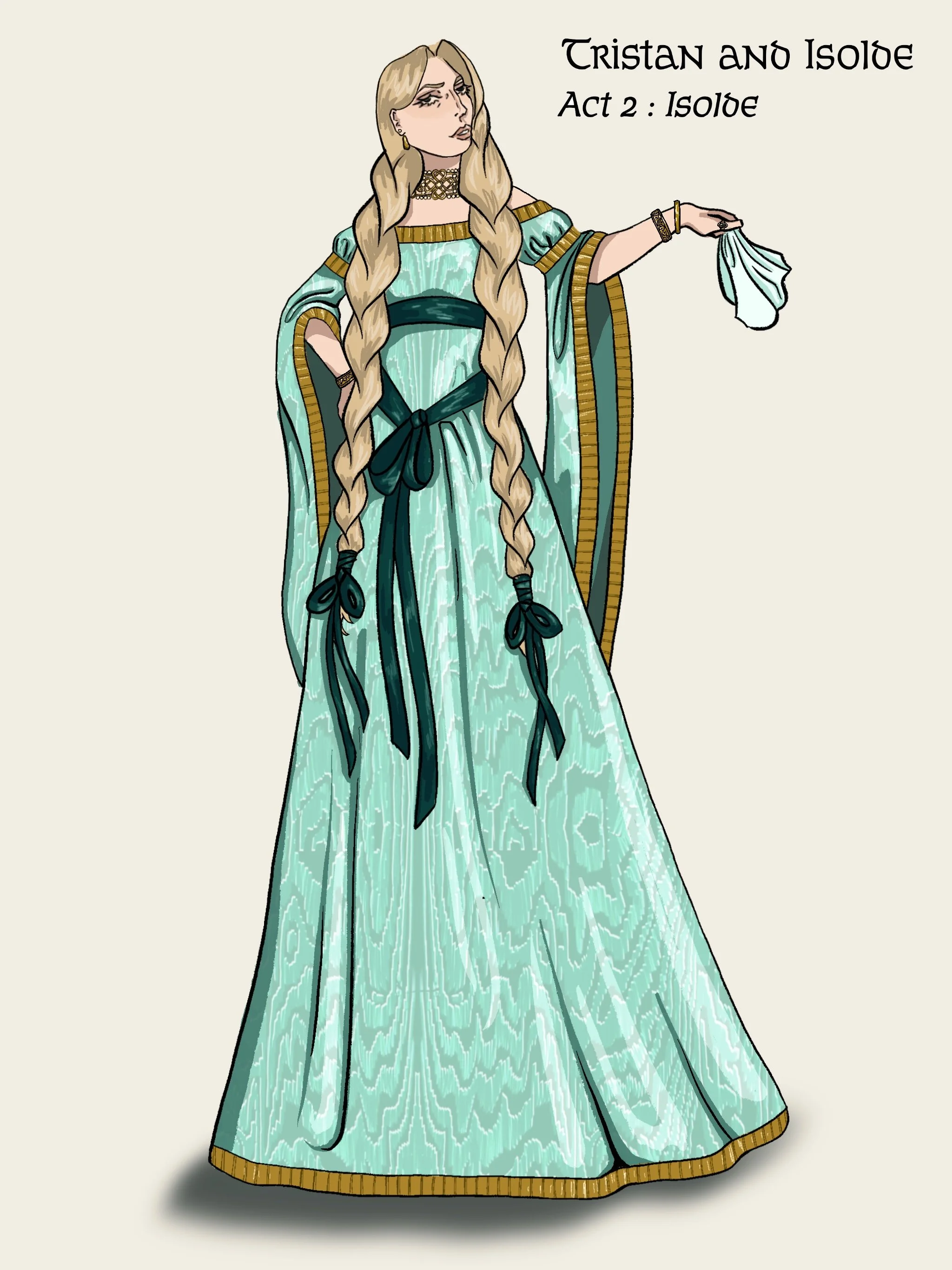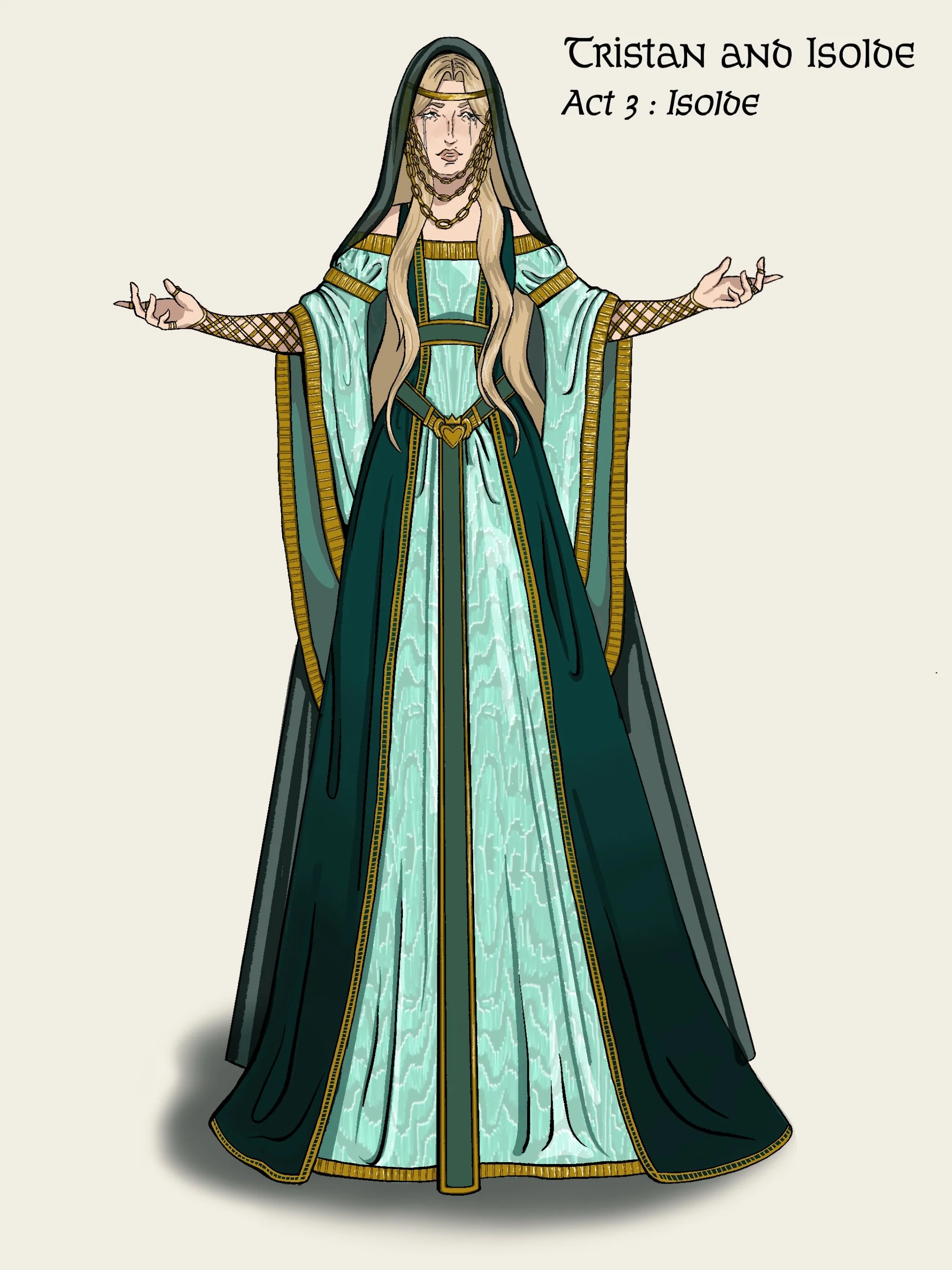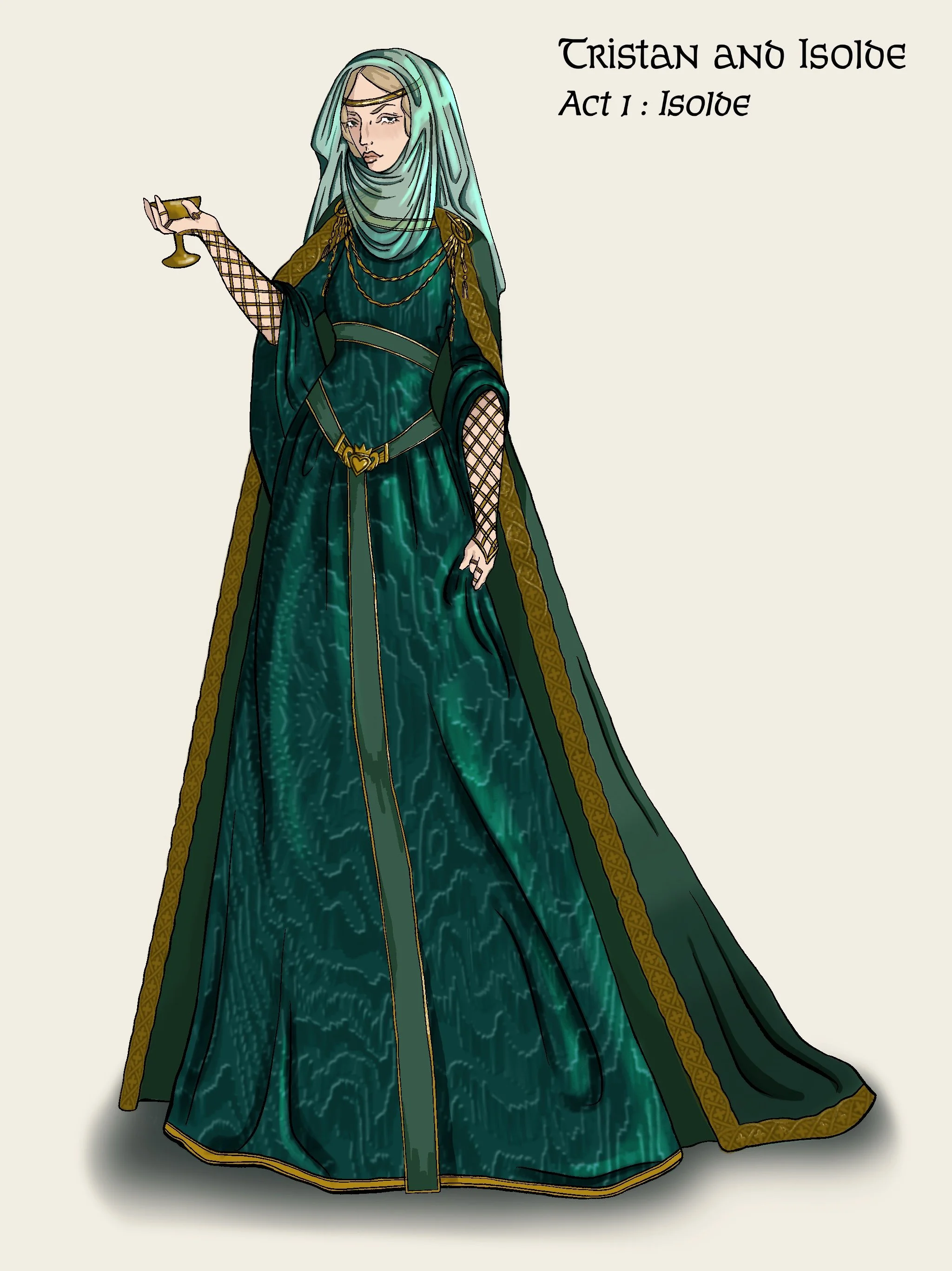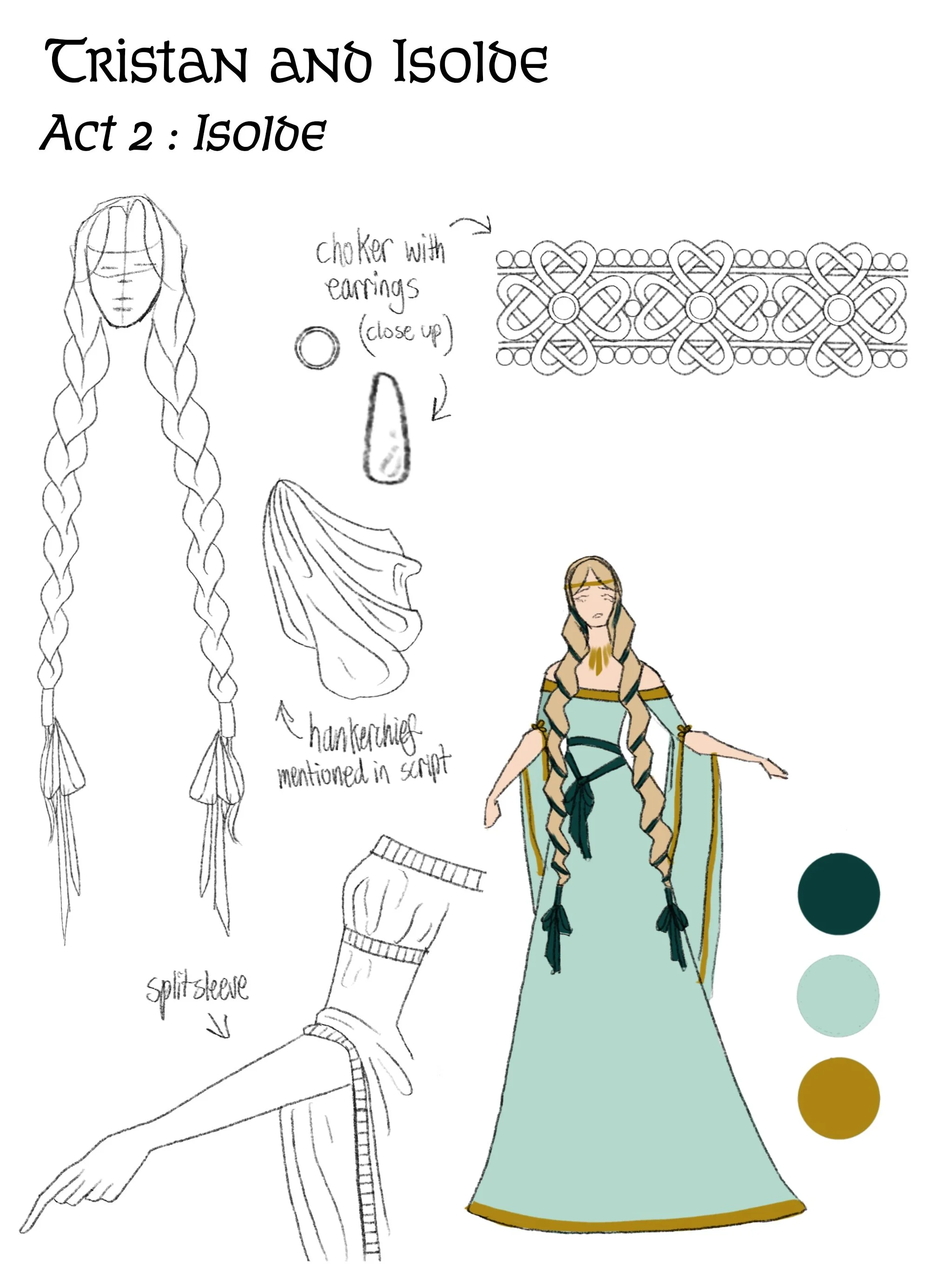 I want to focus on developing Isolde’s psyche and character arc across the three acts, communicated through color, textile, and layering within her costumes. She embodies many facets—Irish princess, witch, bride, queen, and lover. I plan to lean into the darkly feminine and mystical aspects of her character while also using the costumes as a vehicle to express her devotion to Tristan, further reinforcing the central theme of dissonance between love and death.