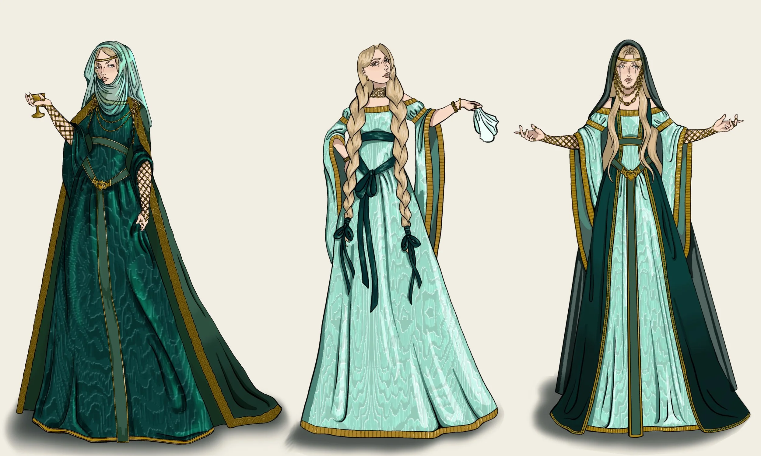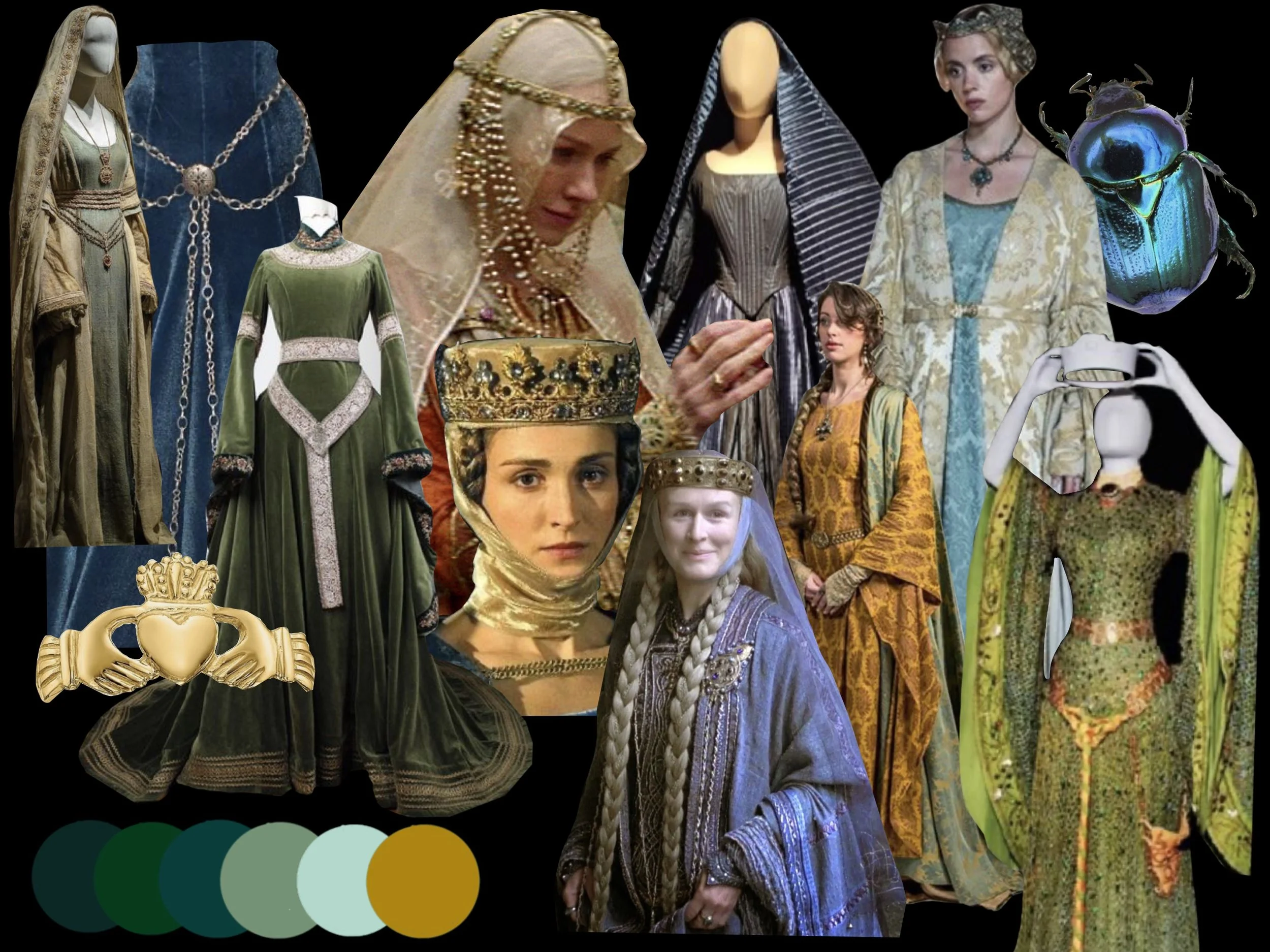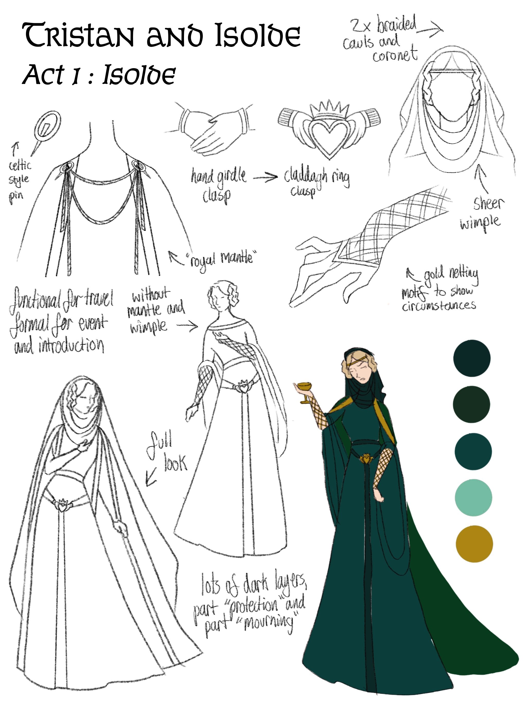 Isolde is dressed primarily in green and gold as visual ties to her Irish roots, as well as the Claddagh ring reference on the girdle.