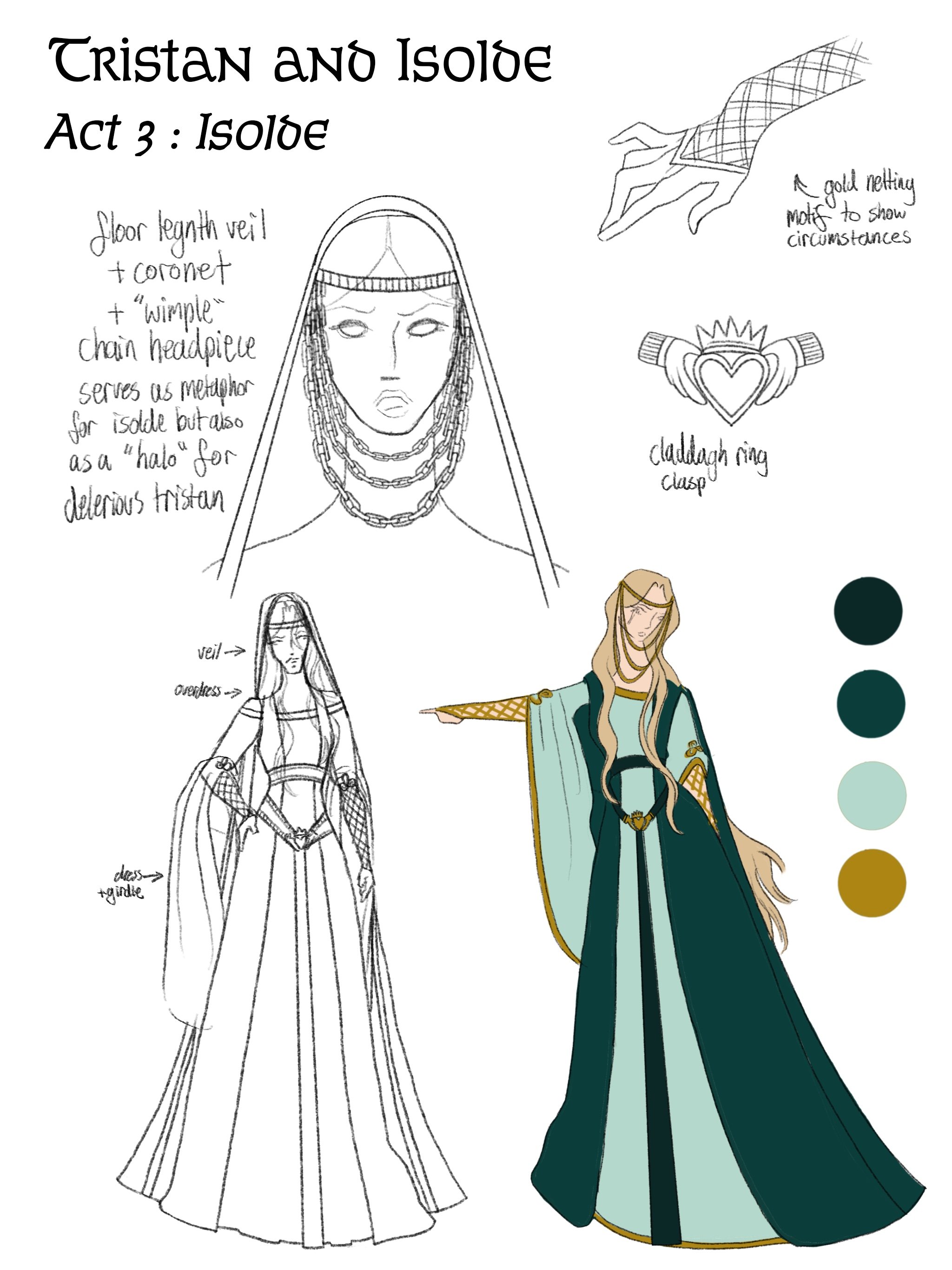 The cord connecting the mantle and the nets on her arm are meant to emphasize the constricting nature of Isolde’s situation.