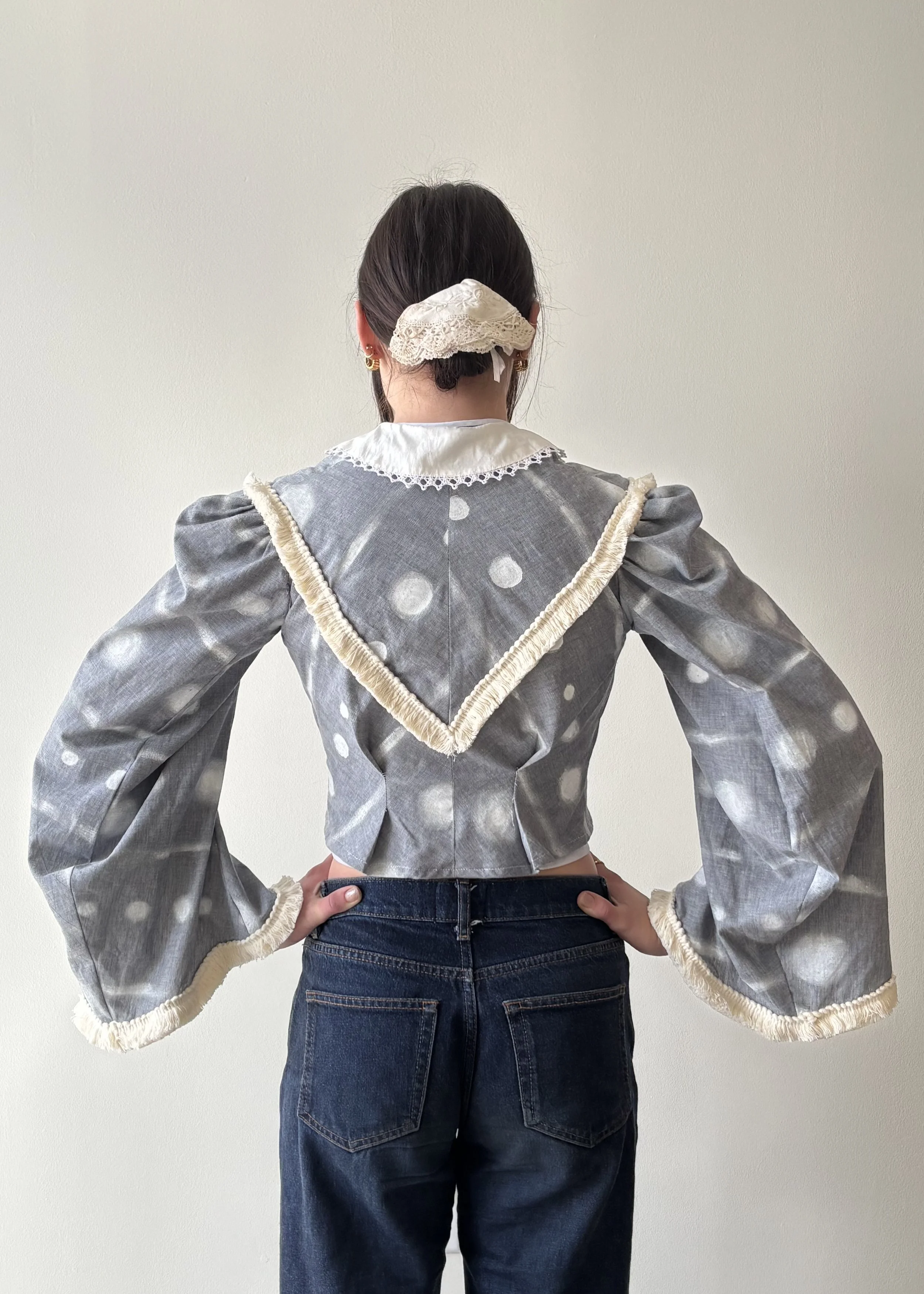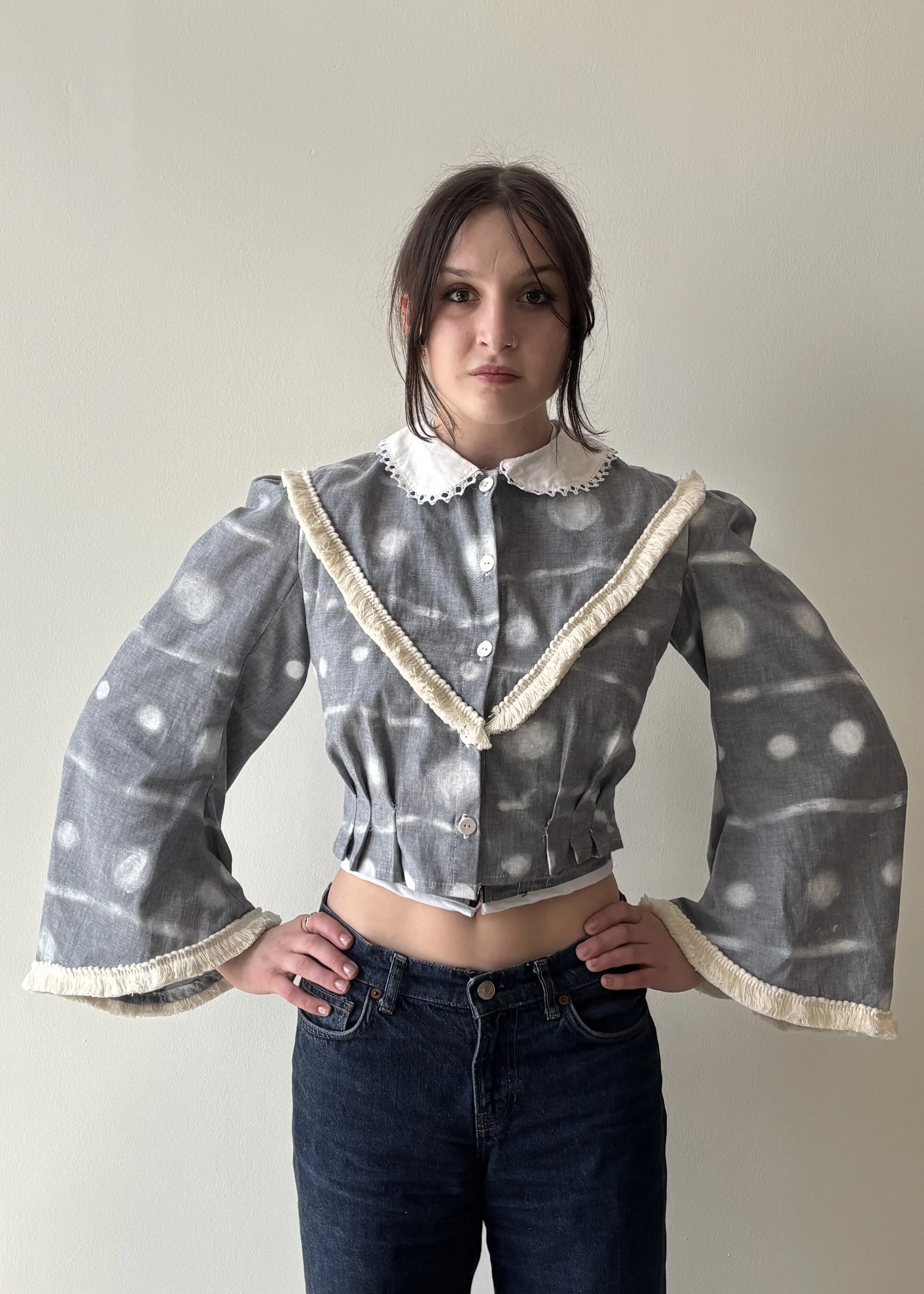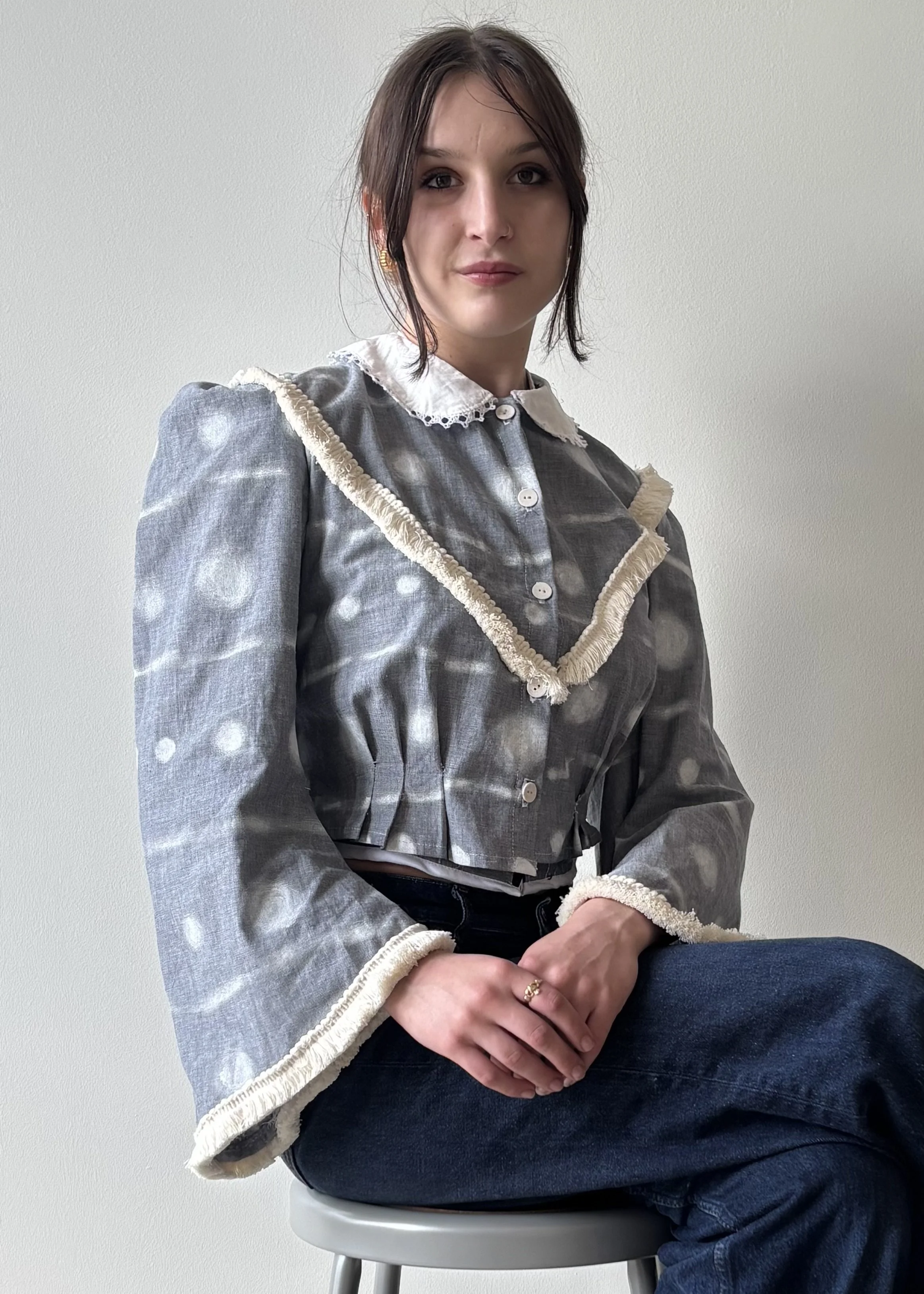 This project challenged us to design and construct a Victorian jacket with a built-in corset inspired by a wild animal. I drew from the whale shark, captivated by its grace despite its immense size and the constellation-like pattern across its body. To achieve this effect, I hand-painted yards of chambray, translating the organic spotting into a textile surface.I refined the silhouette by modifying the original pattern, transforming traditional mutton chop sleeves into exaggerated bell sleeves. This allowed me to reference 1860s Victorian pagoda jackets through the dramatic sleeve shape, structured bodice, and use of tasseled trim. This trim serves a dual purpose, along with the pin tucks create strong vertical movement, echoing the whale shark’s gill structures. Through these elements, the piece merges historical silhouette with natural inspiration, resulting in a design that feels both period-rooted and fluidly organic.